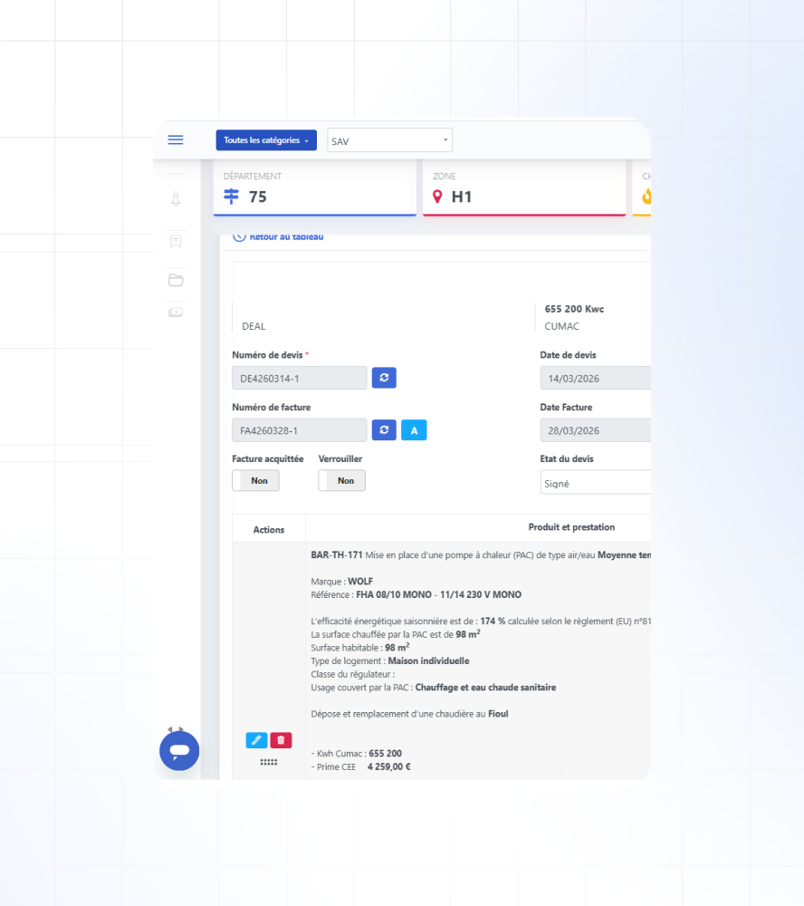 Qhare est le CRM conçu pour les professionnels de la rénovation énergétique et du BTP. De la gestion des leads à la facturation, en passant par le calcul automatique des aides et la planification des interventions, Qhare centralise l'ensemble de l'activité sur une seule plateforme.